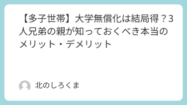 がんばらない節約【多子世帯】大学無償化は結局得?3人兄弟の親が知っておくべき本当のメリット・デメリット 「3人以上の子供がいる家庭は、大学無償化!」このニュースを聞いて、子供を持つ親として、期待と不安が入り混じった方も多いのではないでしょうか。我が家にも子供が2人いるので、一瞬「もう一人作るか?」と本気で考えてしまいました。しかし、この... 2023.12.12 2025.11.09がんばらない節約