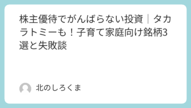 がんばらない節約株主優待でがんばらない投資│タカラトミーも!子育て家庭向け銘柄3選と失敗談 我が家の投資の第一歩は、株主優待目的で始めました。小さい子供が2人いるので、子供関係の優待銘柄に投資しています。優待投資について、体験談として紹介します。私は、投資をはじめるにあたり、証券外務員1種の資格を取得しましたが、優待銘柄に投資する... 2023.12.23 2025.11.09がんばらない節約