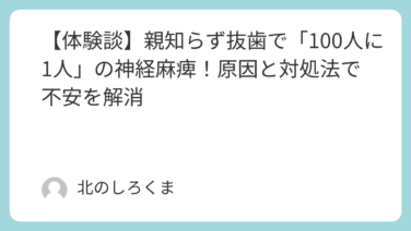 がんばらない家事育児【体験談】親知らず抜歯で「100人に1人」の神経麻痺!原因と対処法で不安を解消 こんにちは、しろくまママです。これを読んでくださっているということは、同じような境遇でまさに不安でいっぱいの方やこれから抜歯を控えている方でしょうか。そんな方たちが不安を軽くしたり、抜歯するか否か選択する助けになればと思います!私は看護... 2023.12.10 2025.11.09がんばらない家事育児