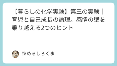 暮らしの化学実験【暮らしの化学実験】第三の実験│育児と自己成長の論理。感情の壁を乗り越える2つのヒント こんにちは、理系パパです。「毎日イライラして、つい子どもに強く当たってしまう」「子どものためと思ってやっていることが、本当に正しいのかわからない」育児は、感情のジェットコースターです。しかし、そこには、あなたが感じるイライラや不安を解... 2024.10.24 2025.09.23暮らしの化学実験