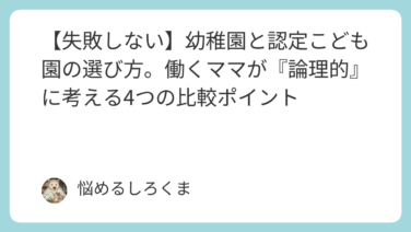 人生の化学方程式専業主婦は「保活で不利」は本当?二児ママが直面した現実と、入園を勝ち取る『論理的な戦略』 こんにちは、しろくまママです。「専業主婦だけど、そろそろ働きたい…」「でも、保育園に入れるのかな…」もし、あなたがそう悩んでいるなら、大丈夫です。**「専業主婦は、保活で不利」**という冷たい現実と向き合い、絶望した私のリアルな体験をお伝... 2025.07.06 2025.09.20人生の化学方程式