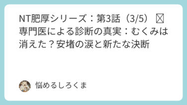 暮らしの化学実験NT肥厚シリーズ:第3話(3/5) 専門医による診断の真実:むくみは消えた?安堵の涙と新たな決断 こんにちは、しろくまママです。前回の記事で、赤ちゃんに**首の後ろのむくみ(NT肥厚)**を指摘され、大きな病院を紹介されたことを書きました。その再診の日、私たちは信じられない言葉を聞くことになります。【このNT肥厚シリーズの全体像】専... 2025.07.06 2025.09.20暮らしの化学実験