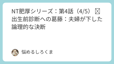 暮らしの化学実験NT肥厚シリーズ:第4話(4/5) 出生前診断への葛藤:夫婦が下した論理的な決断 こんにちは、しろくまママです。前回の記事で、大きな病院でNT肥厚が2.5mmと診断され、安堵の涙を流したことについてお話ししました。しかし、そこで私たちの不安が完全に消えたわけではありませんでした。【このNT肥厚シリーズの全体像】突然突... 2025.07.06 2025.09.20暮らしの化学実験