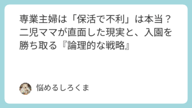 人生の化学方程式専業主婦は「保活で不利」は本当?二児ママが直面した現実と、入園を勝ち取る『論理的な戦略』 こんにちは、しろくまママです。「専業主婦だけど、そろそろ働きたい…」「でも、保育園に入れるのかな…」もし、あなたがそう悩んでいるなら、大丈夫です。**「専業主婦は、保活で不利」**という冷たい現実と向き合い、絶望した私のリアルな体験をお伝... 2025.07.06 2025.09.20人生の化学方程式