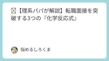 人生の化学方程式【理系パパが解説】転職面接を突破する3つの『化学反応式』 こんにちは、悩めるシロクマの、論理的な問題解決ラボを運営している、しろくまパパです。あなたは、転職面接を『運』と『才能』に任せていませんか?「面接で聞かれることって、だいたい同じだよね?」「答えを丸暗記すればなんとかなるかな…」もし、あ... 2024.01.28 2025.09.20人生の化学方程式