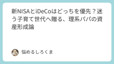 人生の化学方程式新NISAとiDeCoはどっちを優先?迷う子育て世代へ贈る、理系パパの資産形成論 「投資は難しそう…」「何から始めればいいか分からない…」「損するのが怖い…」もし、あなたがそう感じているなら、それは当然のことです。私も、入社3年目で投資を始めた頃は同じ不安を抱えていました。しかし、人事労務の知識と理系的な論理思考を掛... 2025.09.03 2025.09.20人生の化学方程式
