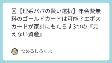 人生の化学方程式【理系パパの賢い選択】年会費無料のゴールドカードは可能?エポスカードが家計にもたらす3つの『見えない資産』 こんにちは、しろくまパパです。「クレジットカードの年会費は、人生における**『見えない負債』**である」私はそう考えています。この考え方は、私が提唱する**「お金のロジックツリー」**という思考法に基づいています。でも、もし、年会費が... 2025.09.11 2025.09.20人生の化学方程式
