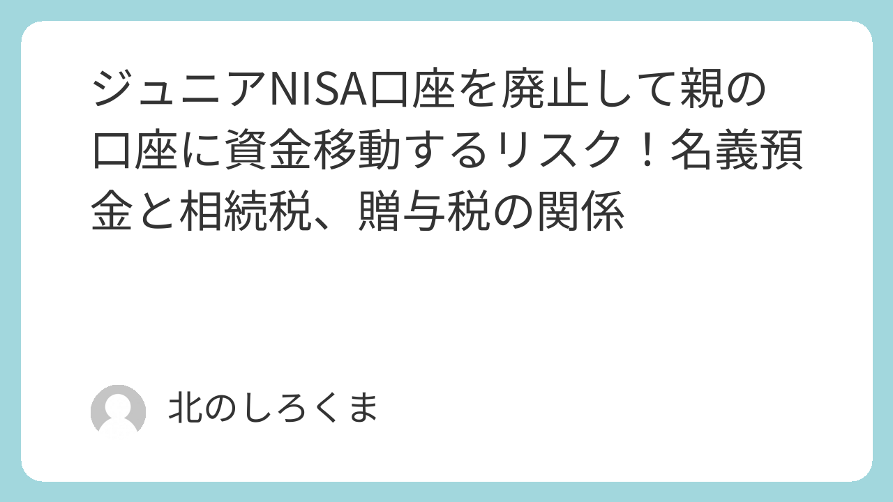 具体的には、兄弟の教育費の格差是正や親の口座への資金回収のためにジュニアNISA口座を廃止し、資金移動した場合に、「親が本来のジュニアNISAの目的(子どもの将来のための資産形成)とは異なる利用をしたとみなされ、遡及課税されるのでは?」というリスクについて調べました。