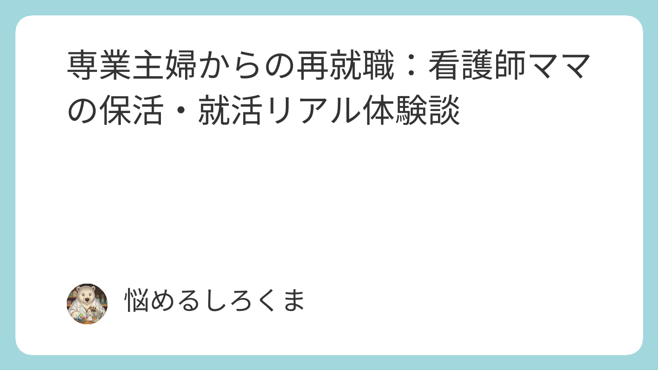 今回は、第1子妊娠を機に看護師を退職して専業主婦となり、第2子出産を終えてから就職活動と保育園活動(就活・保活)をした時の、私の正直な気持ちとリアルな実体験をお話しします。